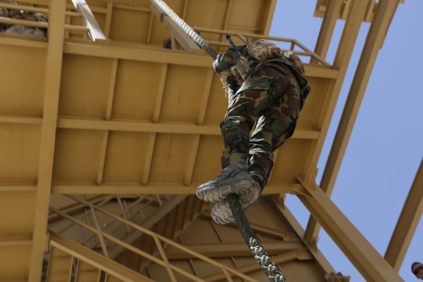 A Female Tactical Platoon member “fast ropes” down a 30-foot rope during a capability exercise called a CAPEX, near Kabul, Afghanistan, July 10, 2018. Fast roping simulates a helicopter infiltration during operations. The Female Tactical Platoon supports Afghan Special Security Forces during counterterrorism operations, specializing in the search, questioning and medical assistance of women and children.