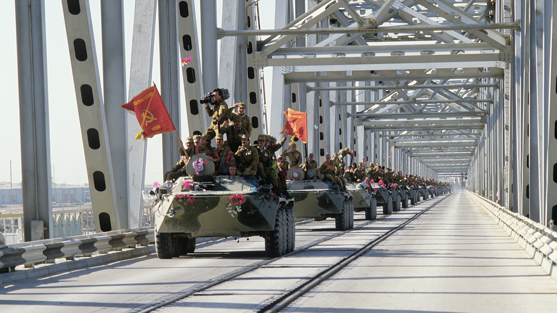 Featured image: A column of armored vehicles crosses the Afghan-Soviet border on the Friendship Bridge over the Amu Darya River. (V. Kiselev/Sputnik via AP.)