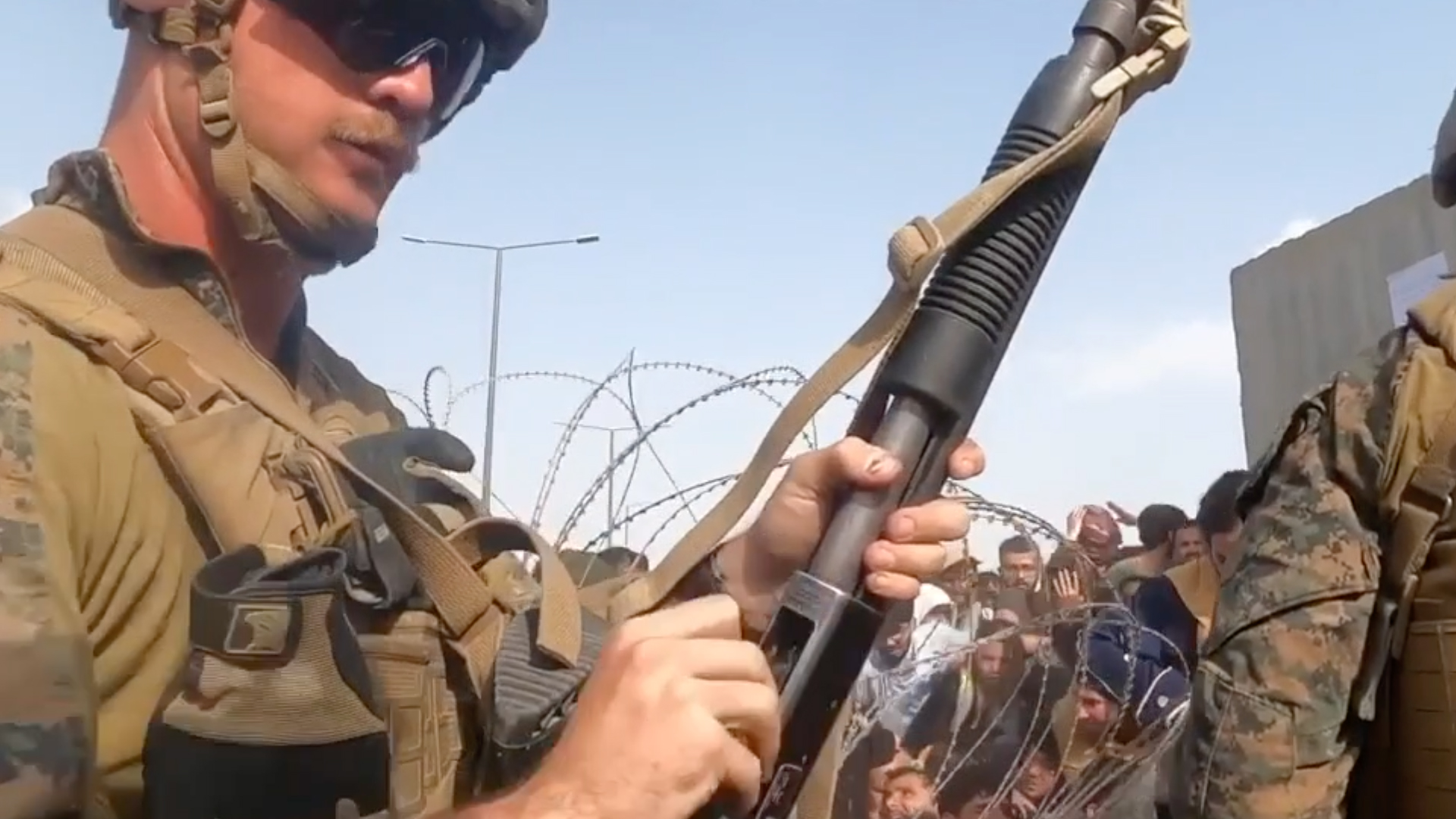 Contrasting the narrative to emerge from military public affairs, which borders on, and at times crosses over into outright propaganda, Markland’s video showed both the good and the bad, and the latter was far more prevalent. Utter chaos is filmed outside the Marine-guarded gate as tear gas is fired. An Afghan writhes in agony after being pushed into concertina wire at the front of the crowd. A Marine fires a bean bag shotgun round at a man. And tens of thousands of desperate Afghans are depicted outside the walls as they truly were: dehydrated, dazed, and terrified.