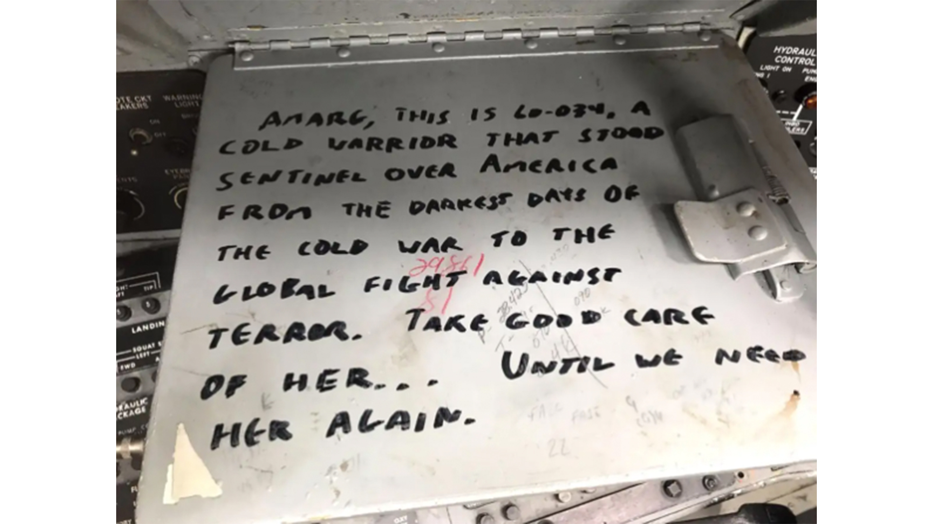 “AMARG, this is 60-034, a Cold Warrior that stood sentinel over America from the darkest days of the Cold War to the global fight against terror,” the panel reads. “Take good care of her… Until we need her again.”