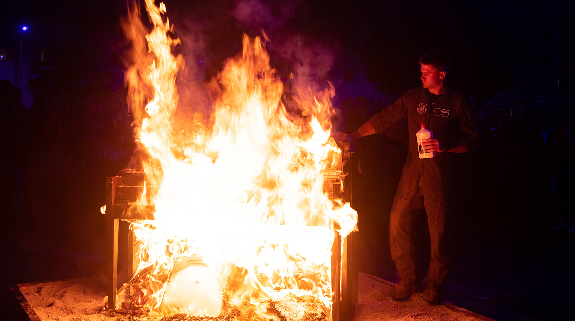 Flyers and other personnel gathered at sunset on Friday, April 25, to burn a piano, a tradition among fighter pilots that dates at least to World War II, in tribute to stunt pilot Rob Holland, who died in a crash on the base the day before.