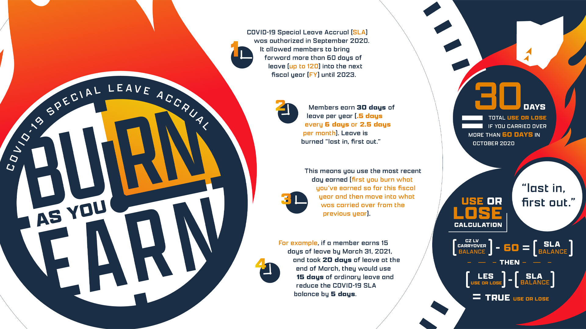 The chart starts off with a nice splashy graphic of a clock on fire with the words “Burn as you earn” written in all-caps across its face. Sick, I was wondering how the COVID-19 leave policy worked, and this looks like a new energy drink! Let’s go!