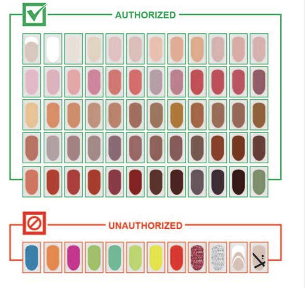 The regulation also now contains an updated chart on permitted nail polish colors. While previous versions contained only vague language about “subdued” hues, the new regs include a full-color chart of 60 approved colors, ranging from various skin tones to dark pink to an olive green. However, a second chart makes clear that brighter colors and nails with designs sparkles or designs are ruled out.