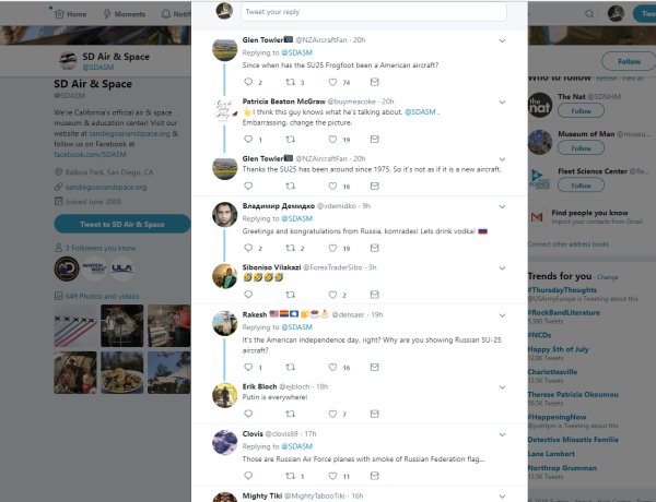 Twitter replies to the post, regarding the Russia origin of the aircraft.