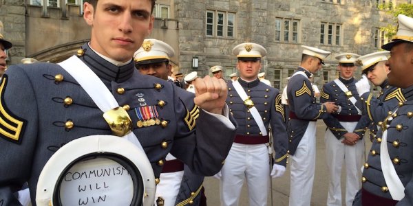A photo of 2nd Lt. Spenser Rapone in a West Point uniform with a paper sign reading “Communism Will Win” tucked into his cover went viral with the hashtag #VeteransForKaepernick on Sept. 24. A self-described “commie/space cowboy,” Rapone identifies himself as a member of the Democratic Socialists of America on his Twitter account.