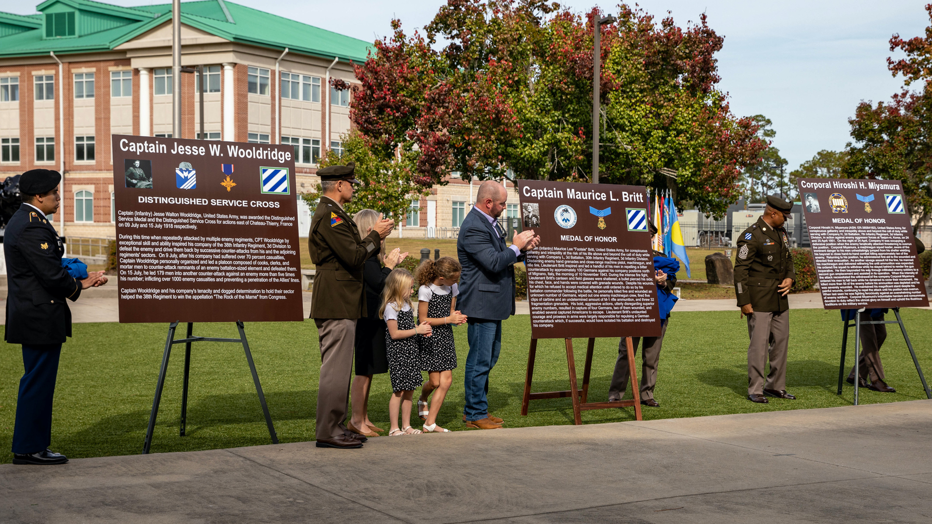 A dedication ceremony on Thursday named three gates to the Army installation after World War I veteran Capt. Jesse Wooldridge, a Distinguished Service Cross recipient, and Medal of Honor recipients Capt. Maurice “Footsie” Britt, who served in World War II, and Cpl. Hiroshi H. “Hershey” Miyamura, who served in the Korean War. All three soldiers served with the 3rd Infantry Division, which is based at Fort Stewart.