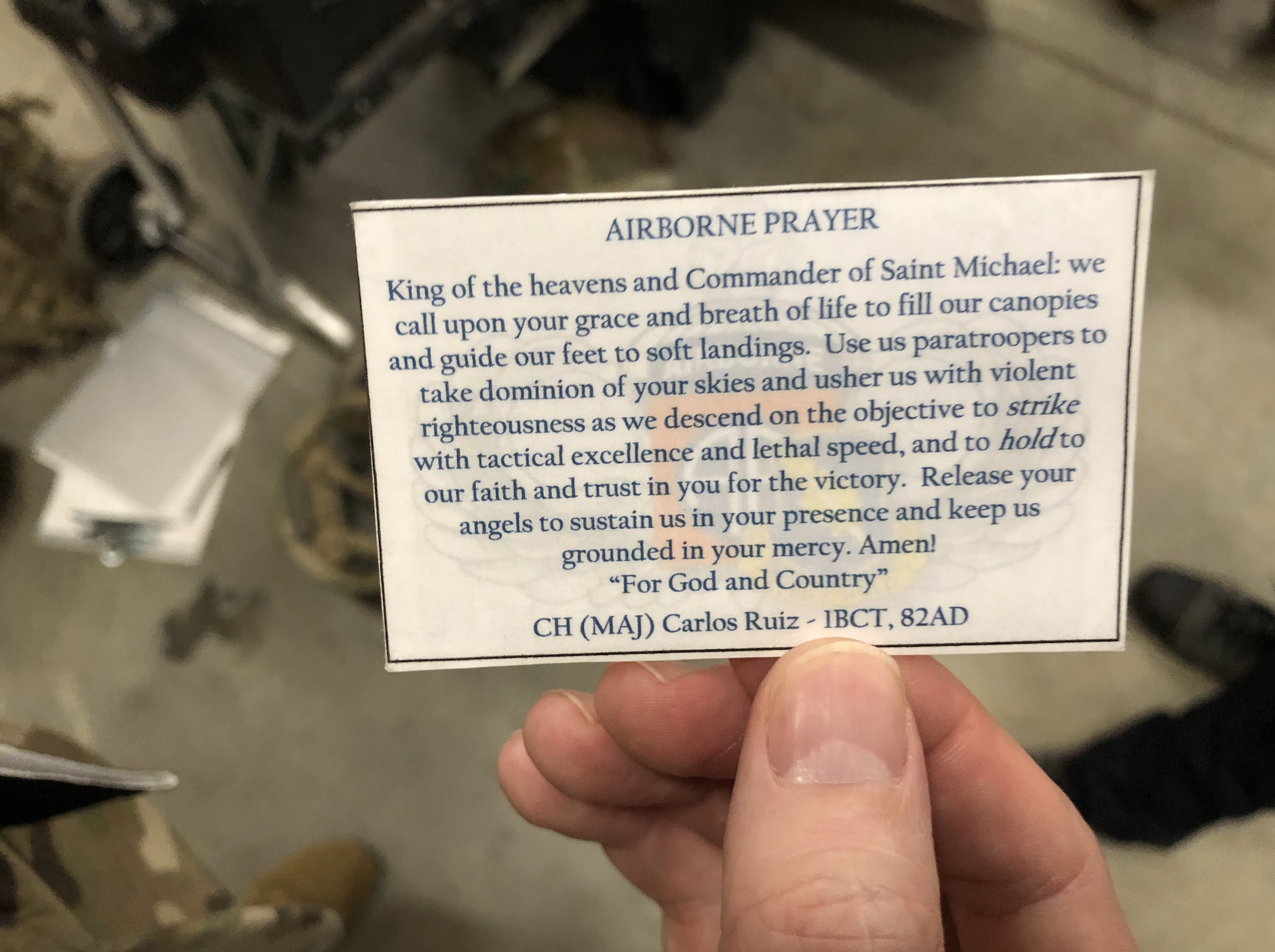 And almost everyone has their own pre-jump rituals, most of which appear to be praying for a safe jump. One soldier sitting nearby was reading a Bible. Another soldier said he prayed for “about 15 minutes straight.” The public affairs officer with 1st Brigade shared a card that he got from the chaplain, on which the Airborne Prayer is written. He keeps it with him on every jump.