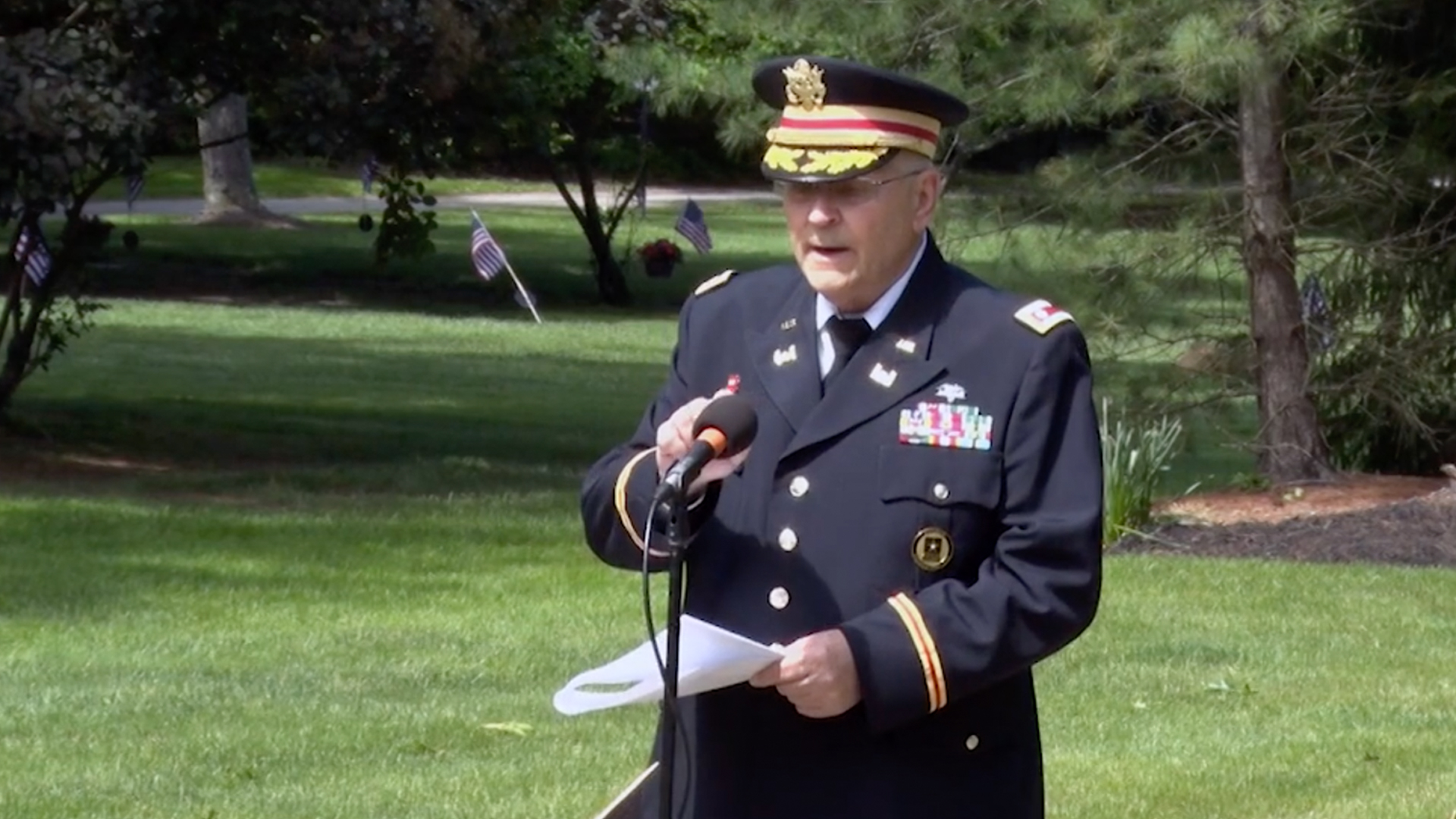 Featured image: Army veteran, Lt. Col. Barnard Kemter, tests his microphone during a speech at a Memorial Day ceremony in Ohio. (Screenshot from Hudson Community Television)