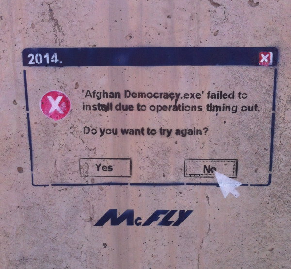 Stencil art ls is common on larger outposts in Afghanistan, where troops express themselves with a little paint on the concrete barricades around the base. These are often funny and only occasionally critical. Having an example like this that is both is a rare treat.