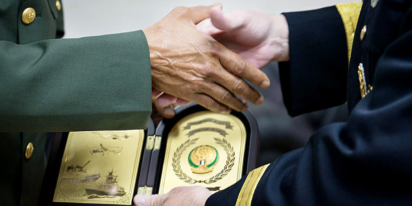 Does Adm. John Richardson, the chief of naval operations, even golf? Ha ha, just kidding: He’s an admiral! And from one admiral to another — the other in this case being Kuwait’s CNO — Richardson apparently needs to work on his short game… in style. Too bad he’s just holding on to the club for an office display.