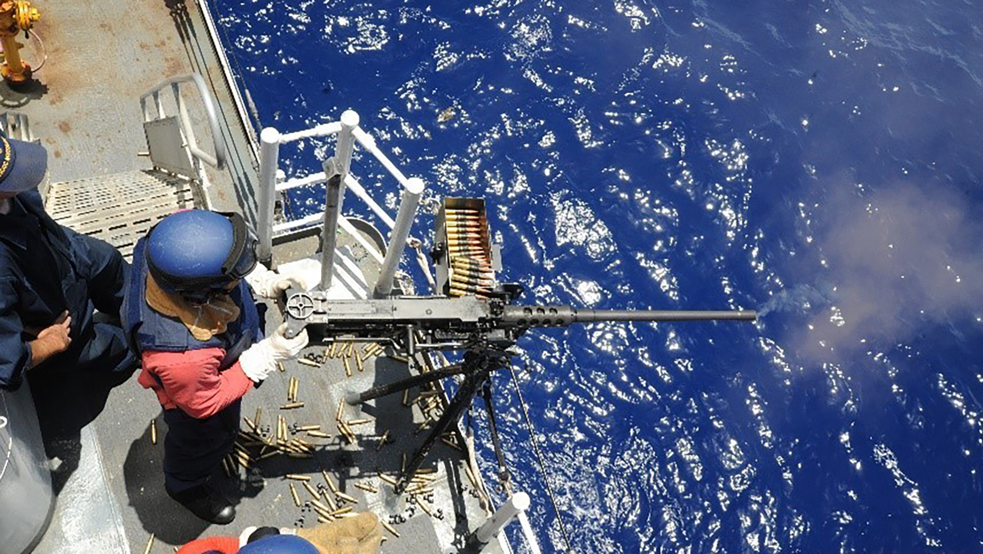 Featured image: Coast Guard Cutter Northland crew members fire .50 caliber machine gun in the West Atlantic Ocean, July 23, 2018 during their Caribbean patrol. (Coast Guard Photo)