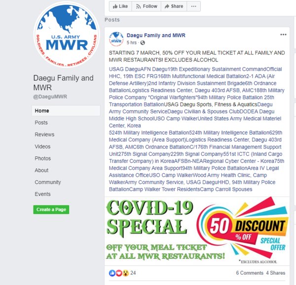 The Morale, Welfare and Recreation team at U.S. Army Garrison Daegu — located near the densely populated city in South Korea — decided that today was the day to announce a new promotion: The COVID-19 Special.