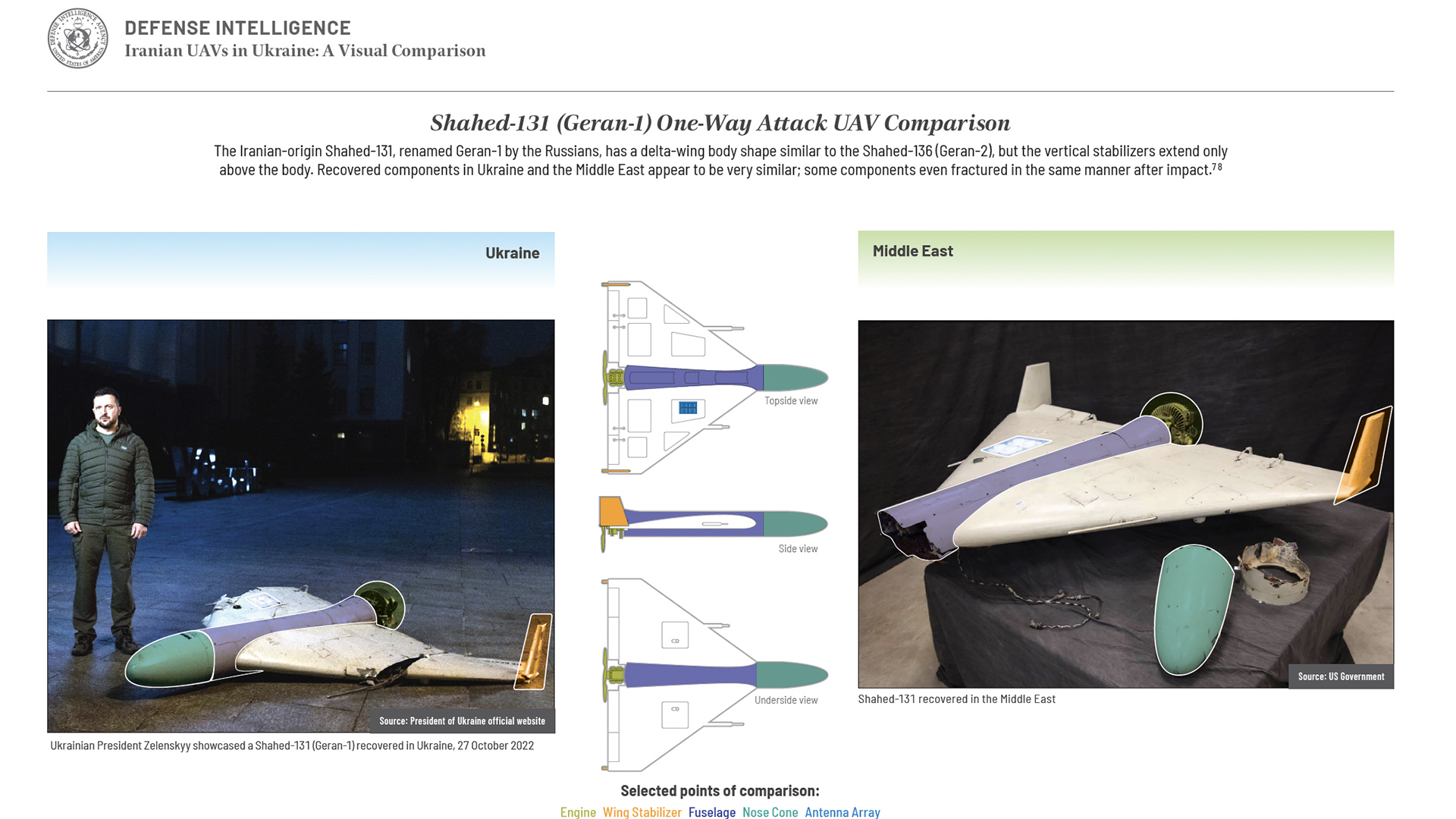 The new unclassified report “provides a visual comparison of UAVs used by Russian forces in Ukraine and Iranian UAVs used to attack U.S. and partner interests in the Middle East,” according to its summary. “Photos of UAV debris and components from Ukraine are consistent with systems showcased at military expos and other venues in the Middle East. This analysis confirms Russia’s use of various lethal UAVs in its war in Ukraine.”