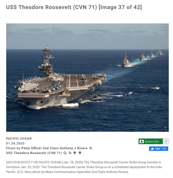 But there’s a problem, obviously: to illustrate America’s naval power, Esper (or his public affairs officers) opted for a photo of the USS Theodore Roosevelt, which is currently laid up in Guam with 1,102 positive cases of COVID-19.