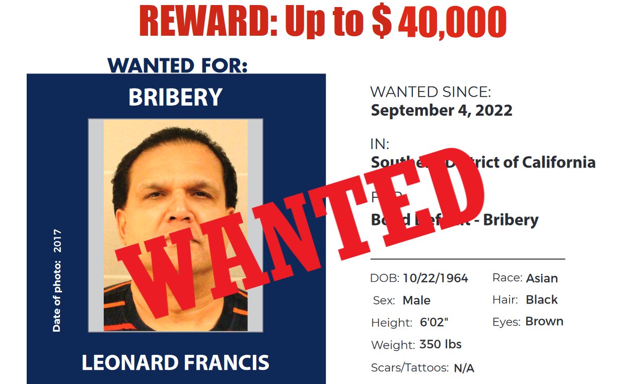 The saga of Fat Leonard now involves a bounty. If you have “information directly assisting in the apprehension” of the wanted fugitive, you could get up to $40,000 in combined rewards.