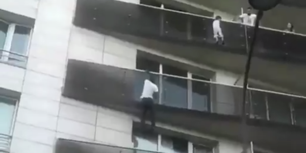 With a combination of grit, agility and muscle, the man hauled himself hand over hand from one balcony to another, springing from one parapet to grasp the next one up. A crowd that had gathered before he began his daring exploit urged him ever upward, according to onlookers’ video that was shared widely on social media.