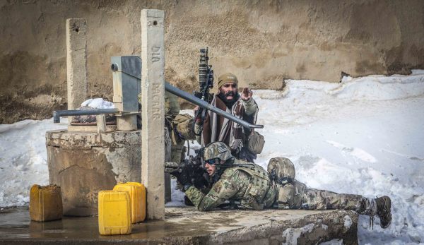 An Afghan operator, with a pretty epic beard and a dirty m-203, signals and communicates during a firefight in eastern Afghanistan while his American counterpart takes cover and sights in.