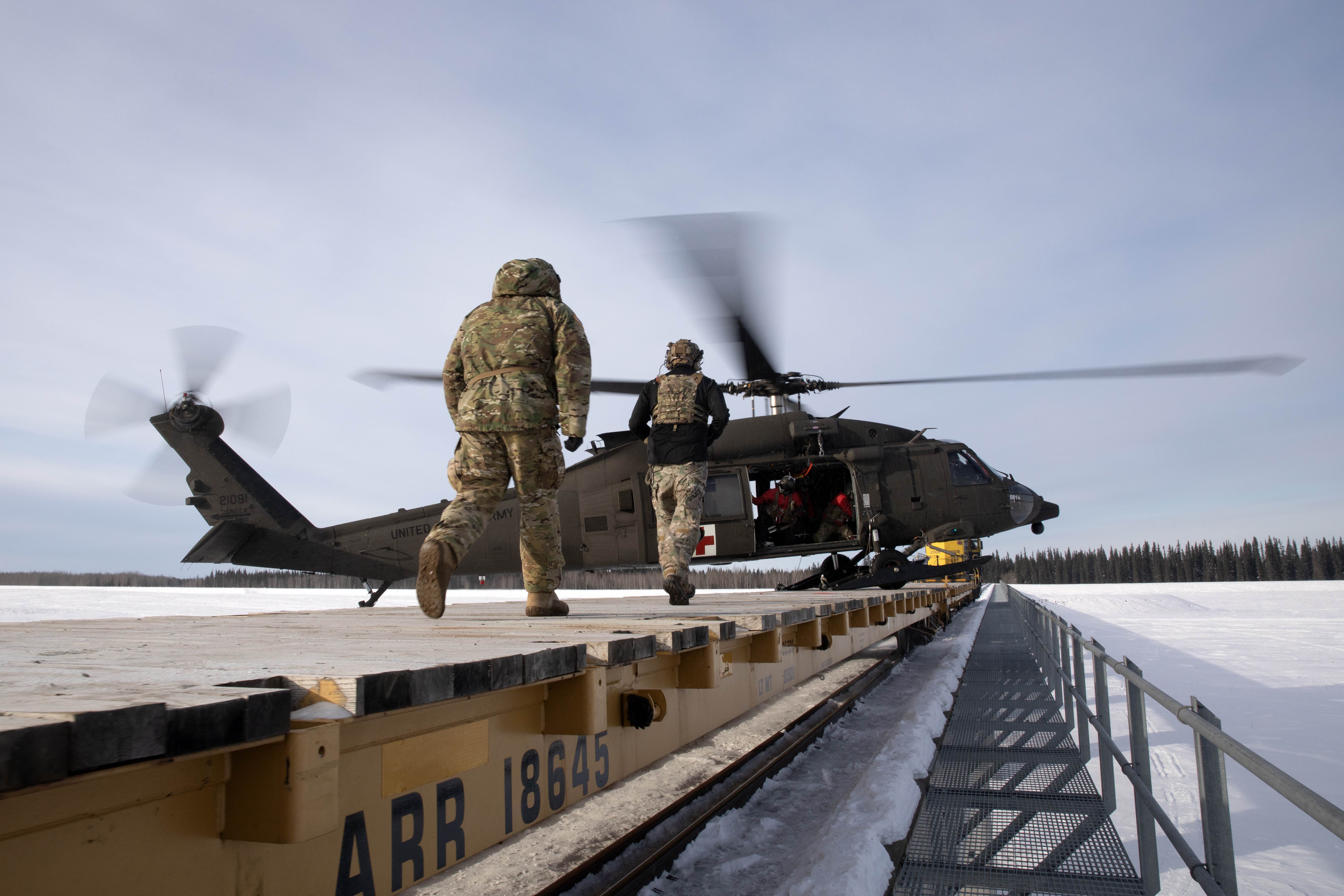 The flight, the Alaska Guard said in a release, was part of an exercise to evaluate how patients who are chemically or biologically contaminated might be moved via a hospital train. Soldiers on the train unloaded supplies from the helicopter while it was perched on the platform and Staff Sgt. Steven Gildersleeve, a critical care flight paramedic, was hoisted onto the train to medically evaluate and evacuate a simulated patient.