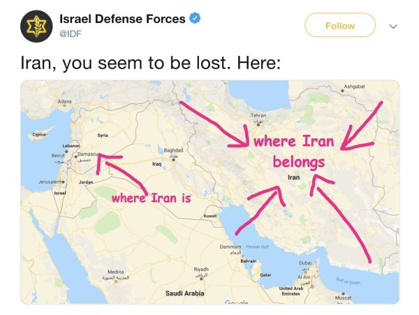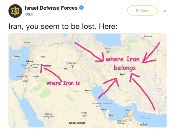The Israeli military followed up on its weekend strikes in Syria the same way that any modern military might: By taunting its regional foe Iran with a silly-ass tweet.