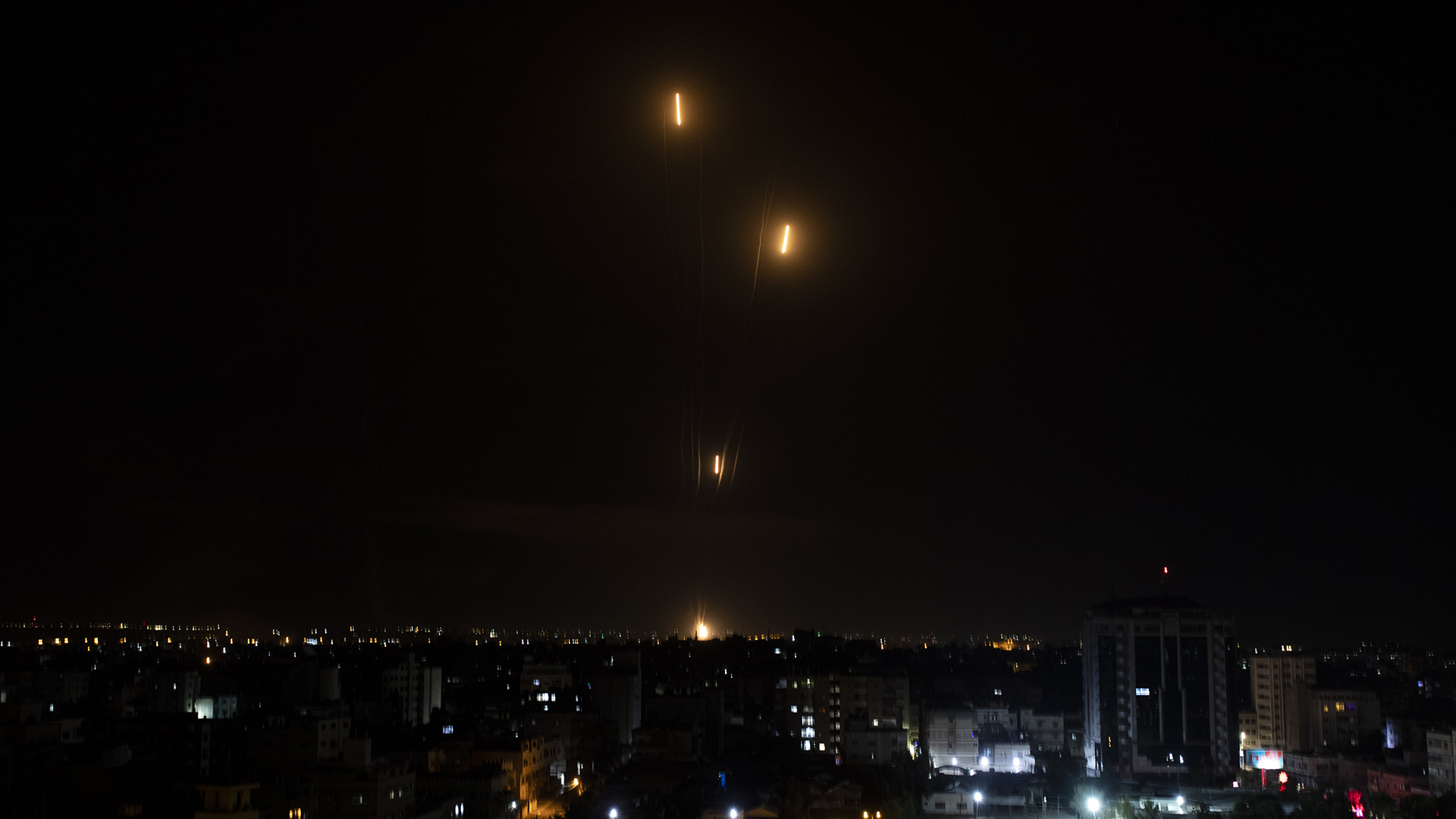 Videos posted on social media showed fusillades of rockets streaming from Gaza toward Israeli cities, including Tel Aviv. The Israeli Defense Forces also posted a video of the U.S.-funded Iron Dome system destroying rockets before they could reach their targets.