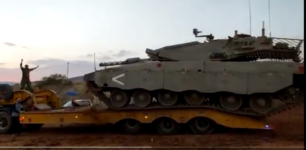 Video circulating on Twitter shows an Israeli Merkava tank flip upside down on Sunday while attempting to drive onto a trailer.
