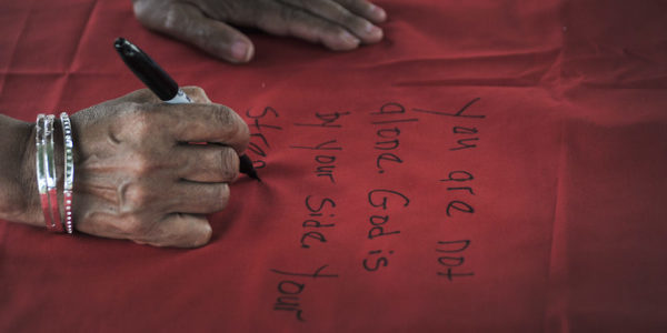 Participants were given the chance to write messages as supporters or survivors of rape or abuse on pieces that will be stitched onto the Monument Quilt during National Night Out August 2, 2016 at Fort George G. Meade, Md.U.S. Air Force photo by Staff Sgt. Alexandre Montes