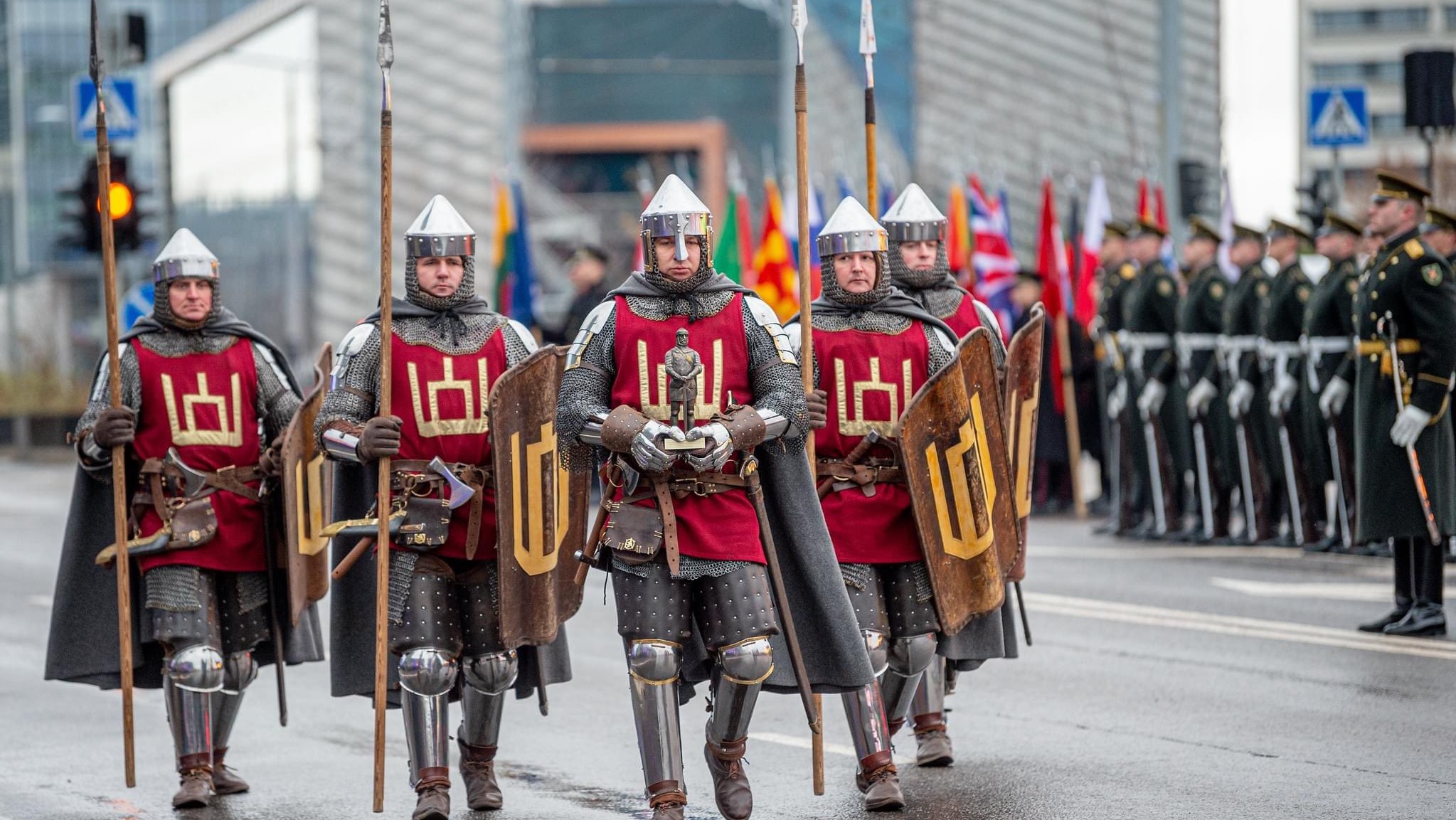 The most striking element on display was a force of five knights. And they truly fit the bill, decked out in chainmail and plate armor. Four carried spears and shields, while the lead knight carried a small statue of a Lithuanian knight. All five had small axes and large swords on their hips and their armor was covered in a bright red tabard bearing the Columns of Gediminas, a historic Lithuanian coat of arms that is also the emblem for the armed forces. Although some of the soldiers in modern military uniforms sported thick beards, these throwbacks to the age of swords and horses were all clean shaven. The nation’s Ministry of Defence itself highlighted the five knights in a post on X (formerly known as Twitter) celebrating Lithuanian Armed Forces Day.