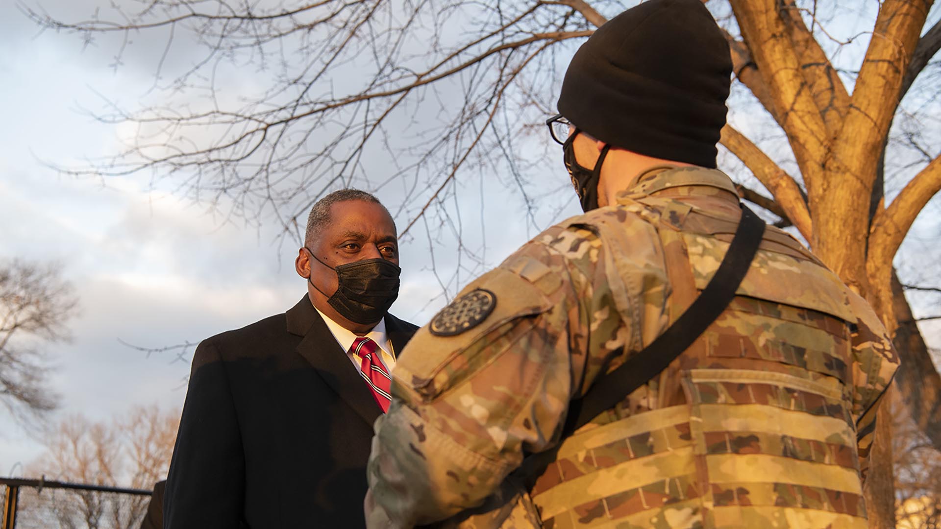 Featured image: Secretary of Defense Lloyd J. Austin III speaks with a Michigan National Guardsman during a visit to the U.S. Capitol building, Jan. 29, 2021. (DOD photo by Air Force Staff Sgt. Brittany A. Chase)