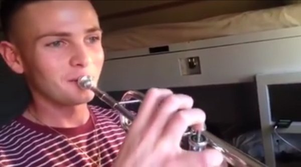 A video posted by Terminal Lance on March 8, with the tagline “Possibly the coolest thing a band Marine has ever done,” shows a Marine playing colors on his trumpet from the upper floor of a military barracks while others mill about below.