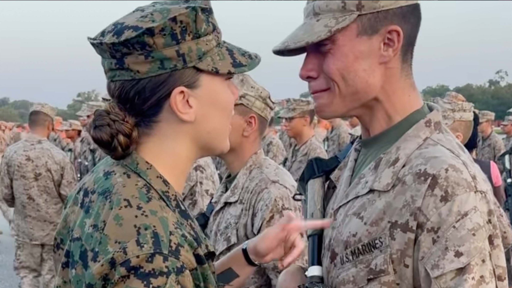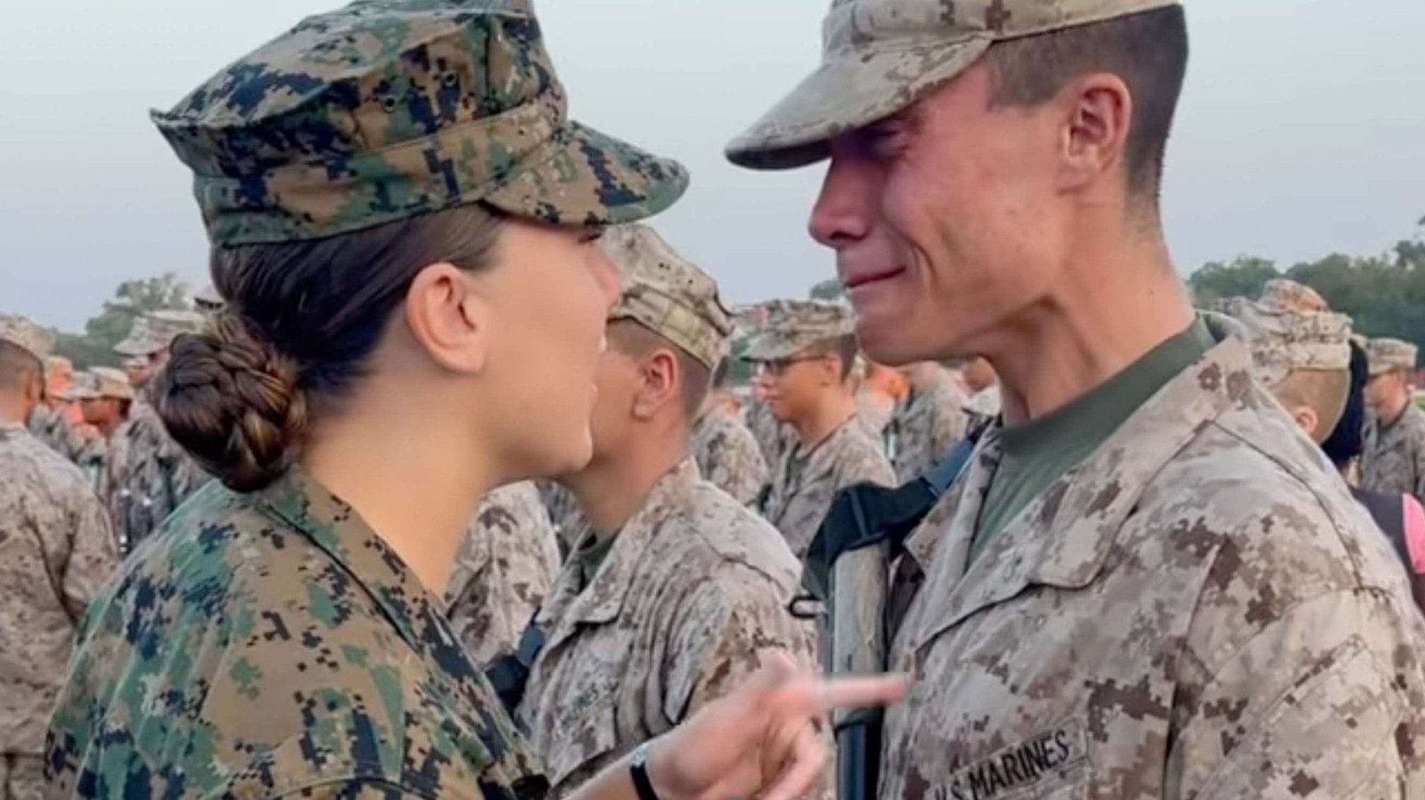 Marines are usually presented the emblem by a Drill Instructor or other training official when they complete the multi-day training event at the end of recruit training (another Marine can be seen awarding EGAs behind the pair in the formation). But Hairfield stepped in to pass along her own to her brother.