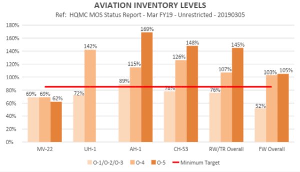 As of March 2019, according to the MOS inventory report from HQMC, overall fixed-wing, company grade (O-1 through O-3) aviation strength stood at a staggering 52%. This value encompasses all aviators for the C-130, F-35, F-18, and AV-8B communities.