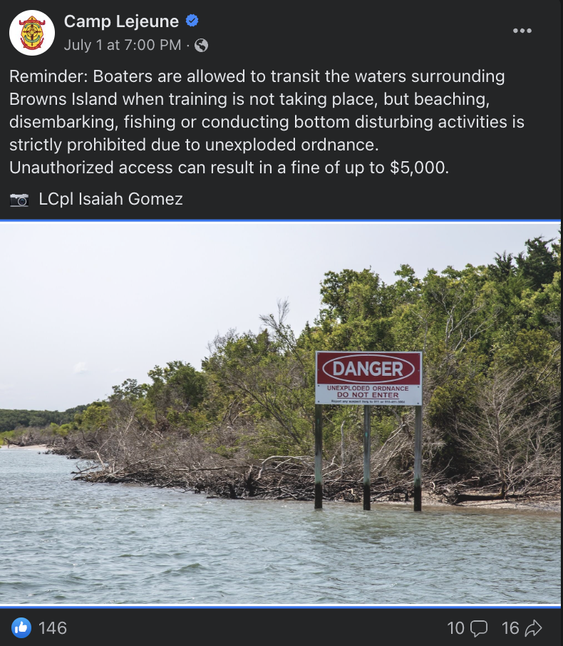Authorities on LeJeune posted about the island on the base’s Facebook page last month and the Marine Corps has been known to take journalists to the island to spread the word on its dangers.