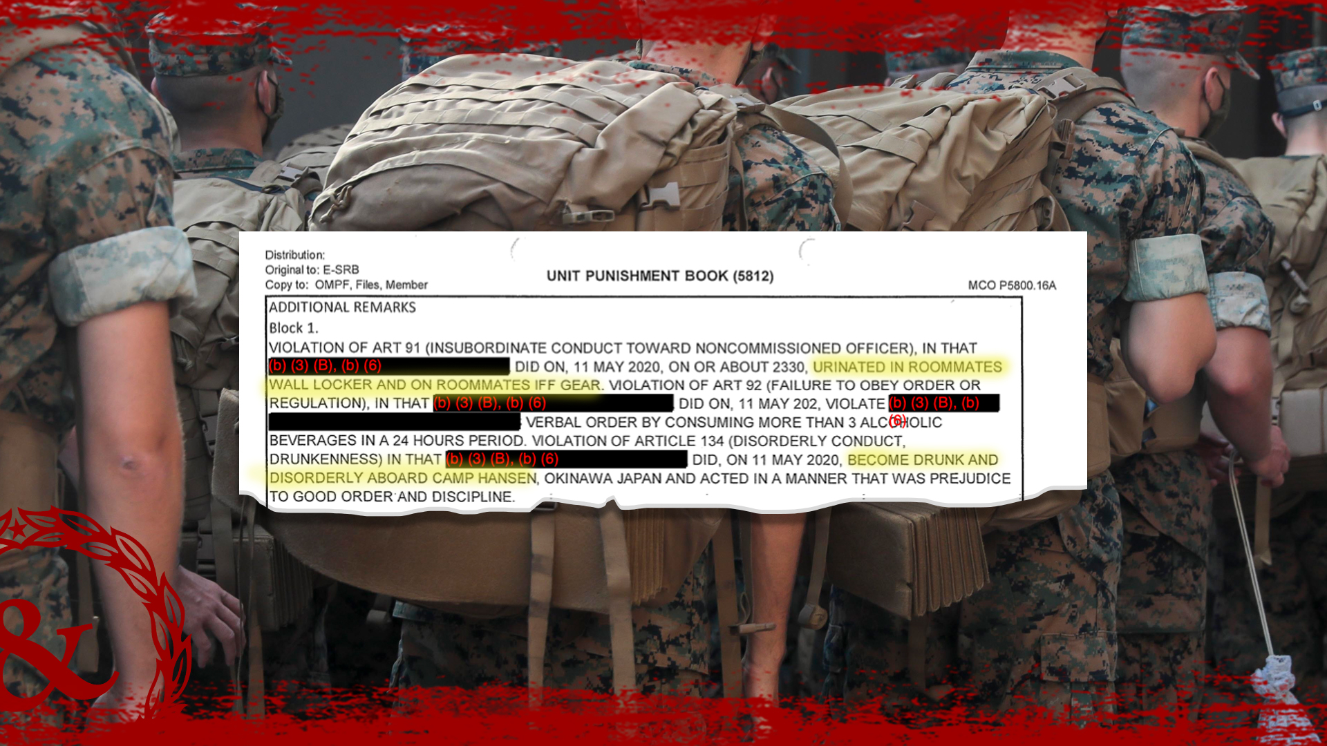 The regiment is home to three battalions of infantrymen and support personnel who are currently focused on operations in the Pacific and countering China. And Fox Company of the 2nd Battalion in particular is home to a Marine lance corporal who, on May 11, 2020, became “drunk and disorderly aboard Camp Hansen, Okinawa Japan and acted in a manner that was prejudice [sic] to good order and discipline,” according to an entry in the Unit Punishment Book, a bureaucratic highlight reel of sorts for Marine disciplinary issues.