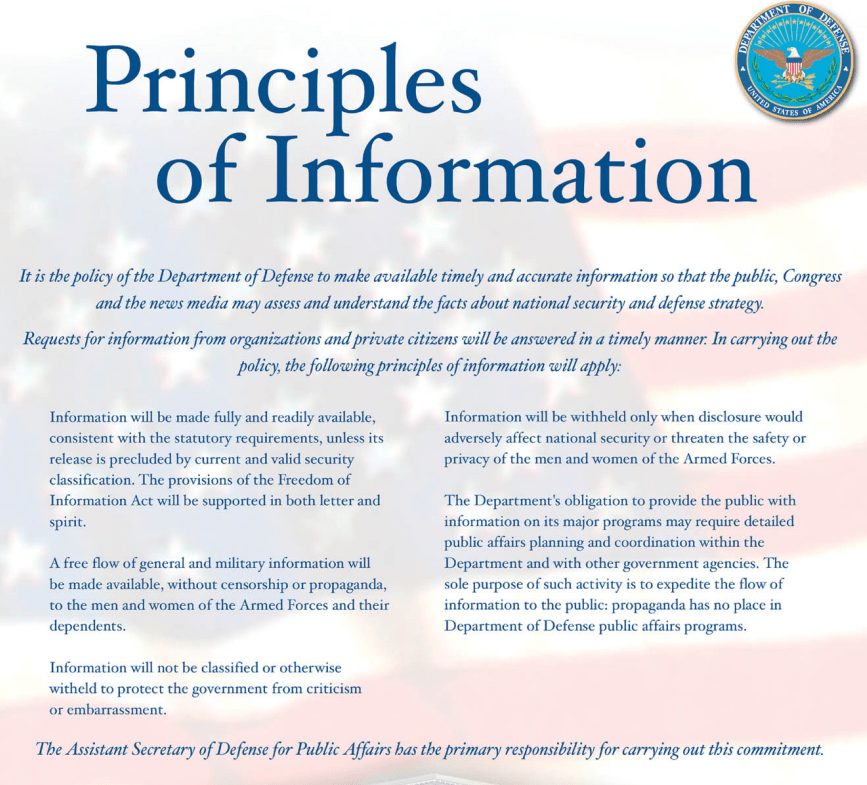 Indeed, the Department of Defense operates under a 2001 policy that “information will not be classified or otherwise withheld to protect the government from criticism or embarrassment.” Known as the Principles of Information, the policy requires the U.S. military to “make available timely and accurate information so that the public, Congress and the news media may assess and understand the facts about national security and defense strategy.” It goes on to add that information “will be withheld only when disclosure would adversely affect national security or threaten the safety or privacy of the men and women of the Armed Forces.”