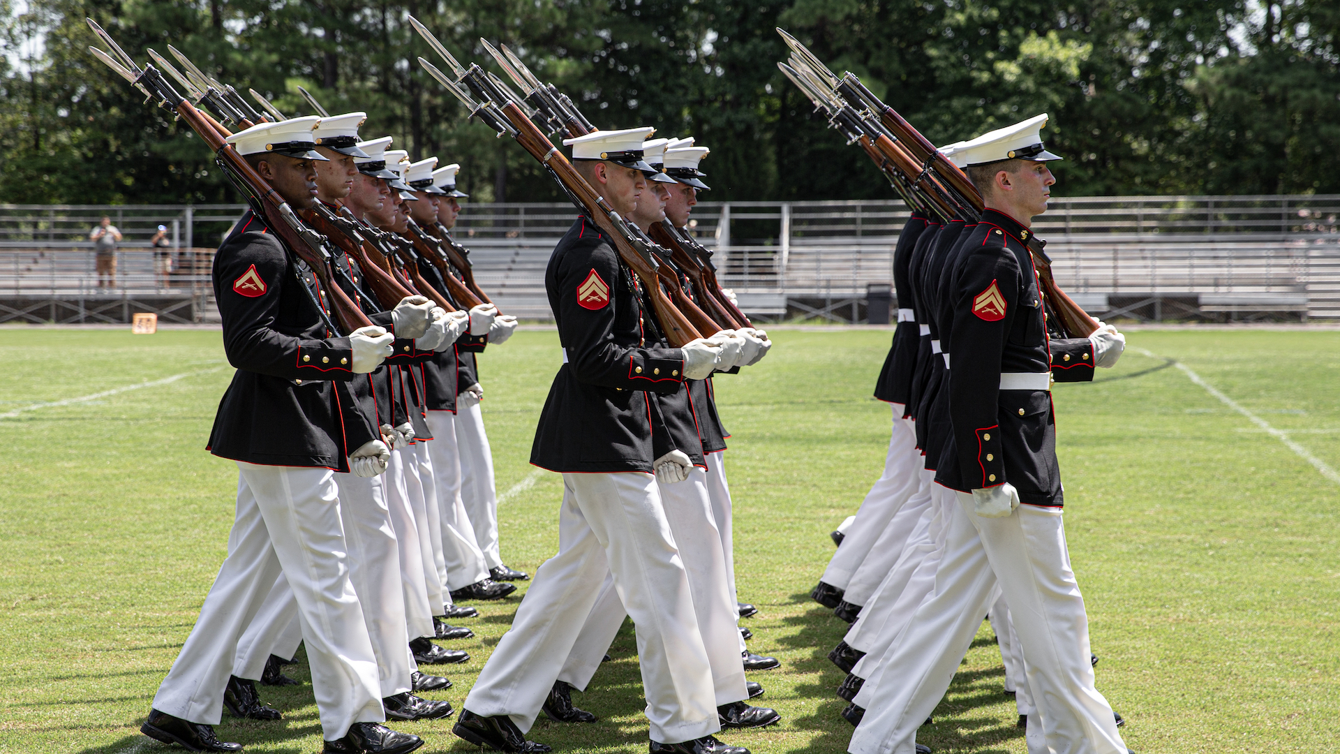 The 24 members of the platoon perform their precise drill movements and handling of their hand-polished ten-and-a-half pound M1 Garand rifles with bayonets mounted without cadence or commands. The routine also involves an inspection sequence that includes spinning and tossing the rifle in the air.
