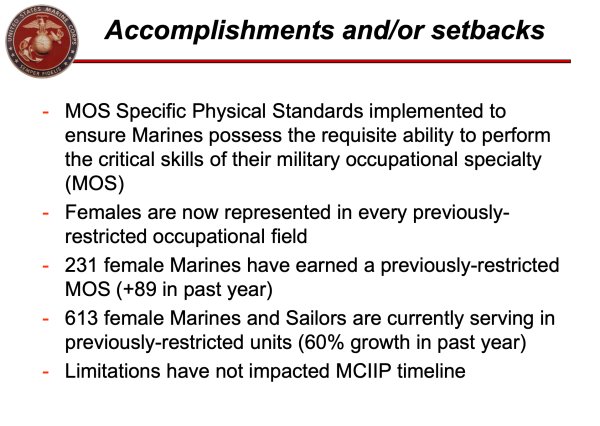 “Females are now represented in every previously-restricted occupational field,” reads a powerpoint released this month on the Marine Corps Integration Implementation Plan (MCIIP), which notes that 60% of those female Marines and sailors now serving in previously-restricted units joined those units in the past year.