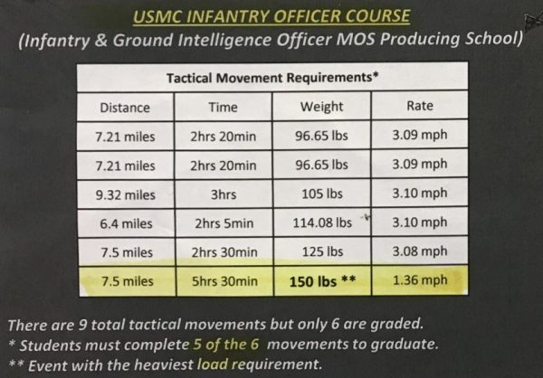 According to a side-by-side comparison of Marine Corps and Army officer training hikes regimen, updated in October 2016, the IOC maneuver requirements are far more intense than those faced by even the elite Army Rangers.