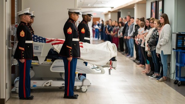 Sarah wanted her husband to go out with an Honor Walk, and it wasn’t just the Marines who showed up to bid Moore farewell. Lining the hallways of the hospital were all the nurses, doctors and even fellow patients who had helped Moore and his family through their eight-year struggle.