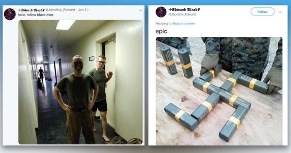 Mead had repeatedly praised Nazis and their World War II collaborators on his Twitter account. He also shared images taken while in Marine uniform, such as one of himself wearing dark camouflage face paint in which he wrote, “hello, fellow black men.” Another showed high explosives being formed into a Nazi swastika, which he wrote was “epic.”