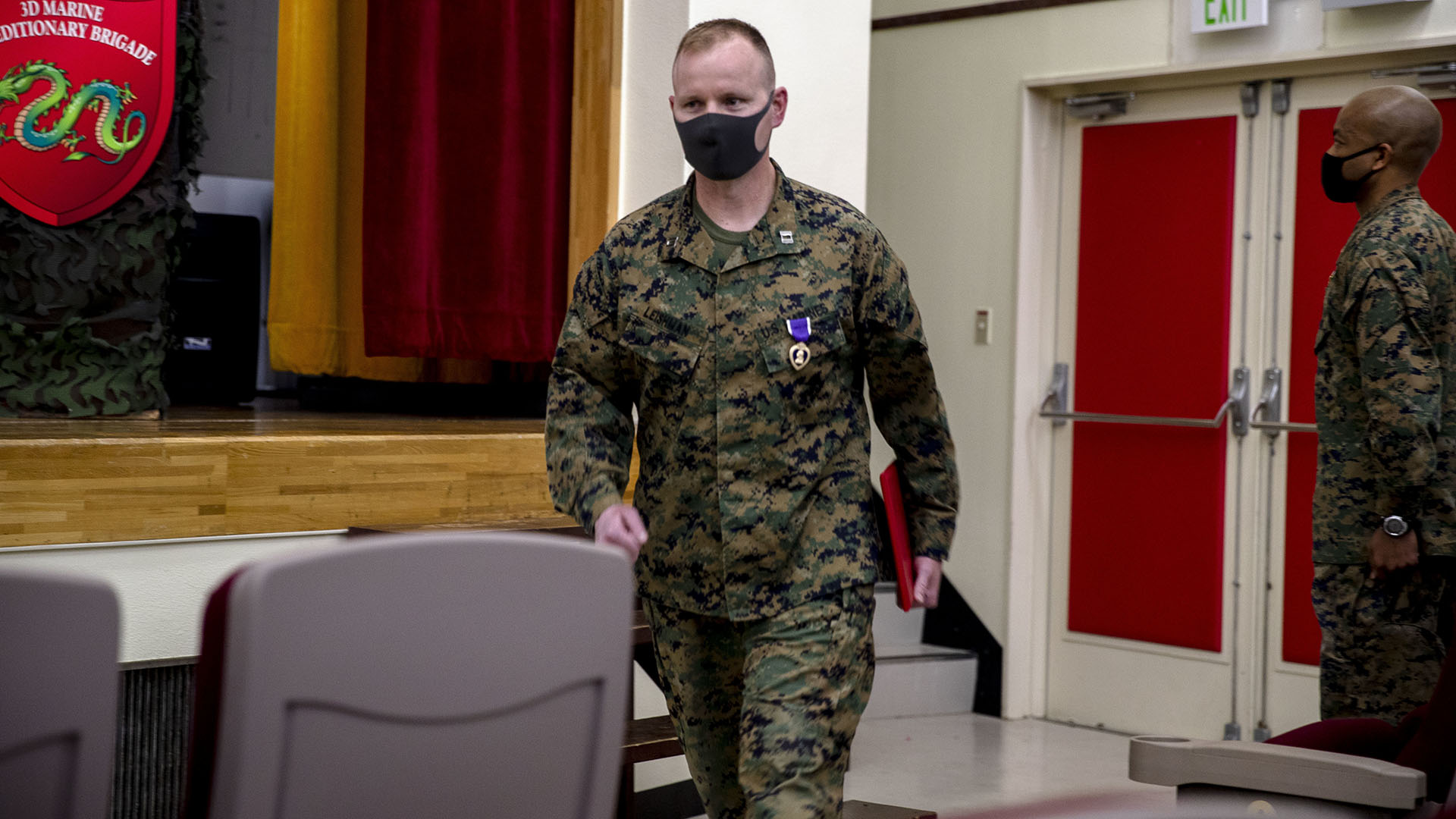 Featured image: U.S. Marine Corps Capt. Kevin W. Leishman, an Anti-Terrorism force protection officer, 3rd Marine Expeditionary Brigade, returns to his seat after being awarded the Purple Heart medal at the base theater, Camp Courtney, Okinawa, Japan, Feb. 24, 2021. (U.S. Marine Corps photo by Cpl. Francesca Landis)