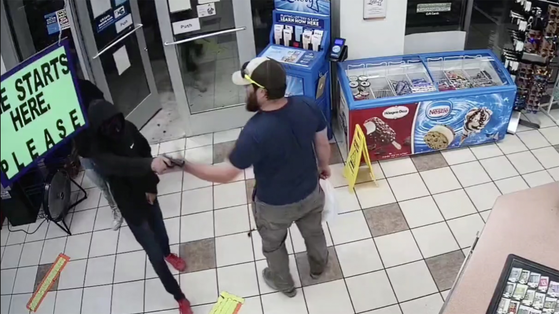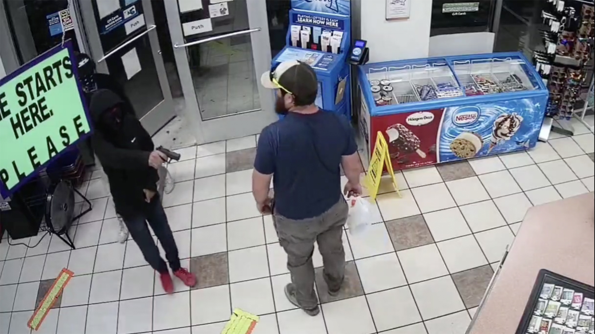 The gas station’s surveillance camera caught the scene as Kilcer, who was in arm’s reach of the armed robber, counterattacked.