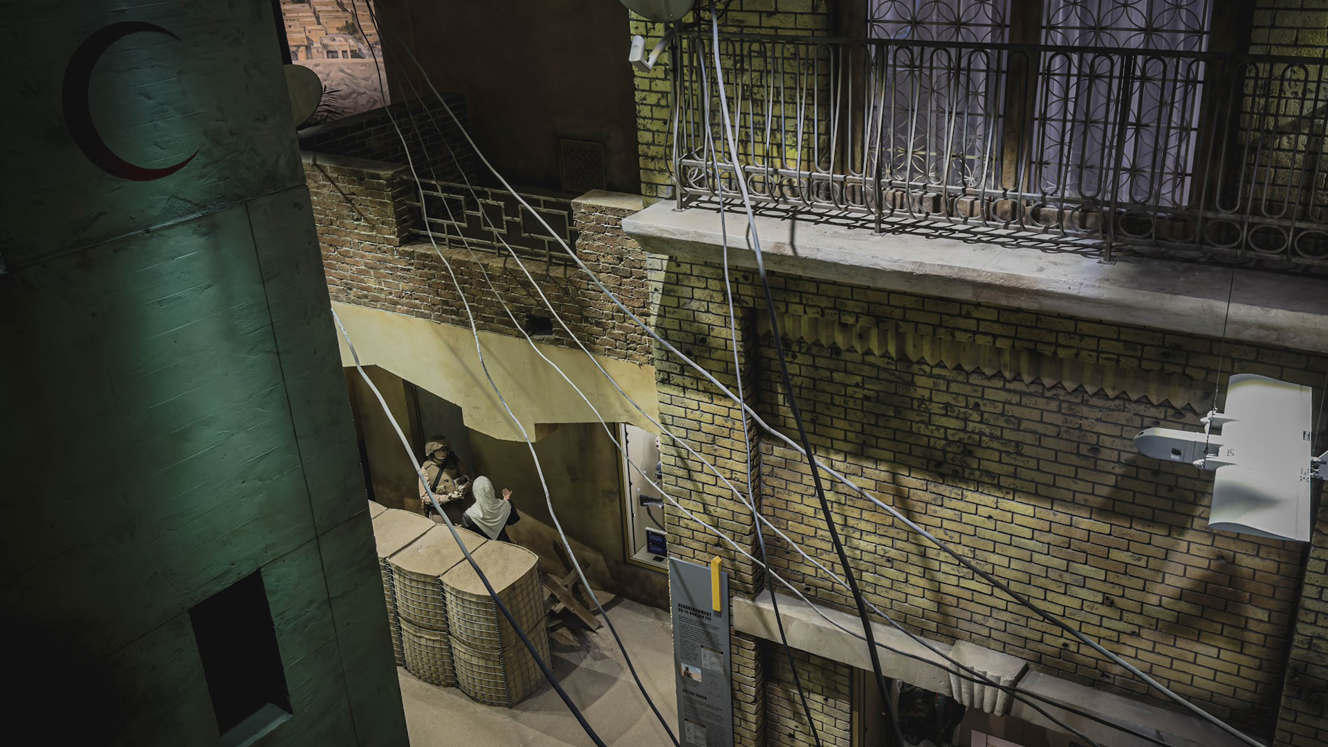 The effluvium hits you as soon as you enter the exhibit, which recreates the sights, sounds, and smells of urban combat in Iraq. On the ground, there are crushed milk and water bottles, juice cartons, wrappers, boxes, other pieces of garbage and what looks like foul water.