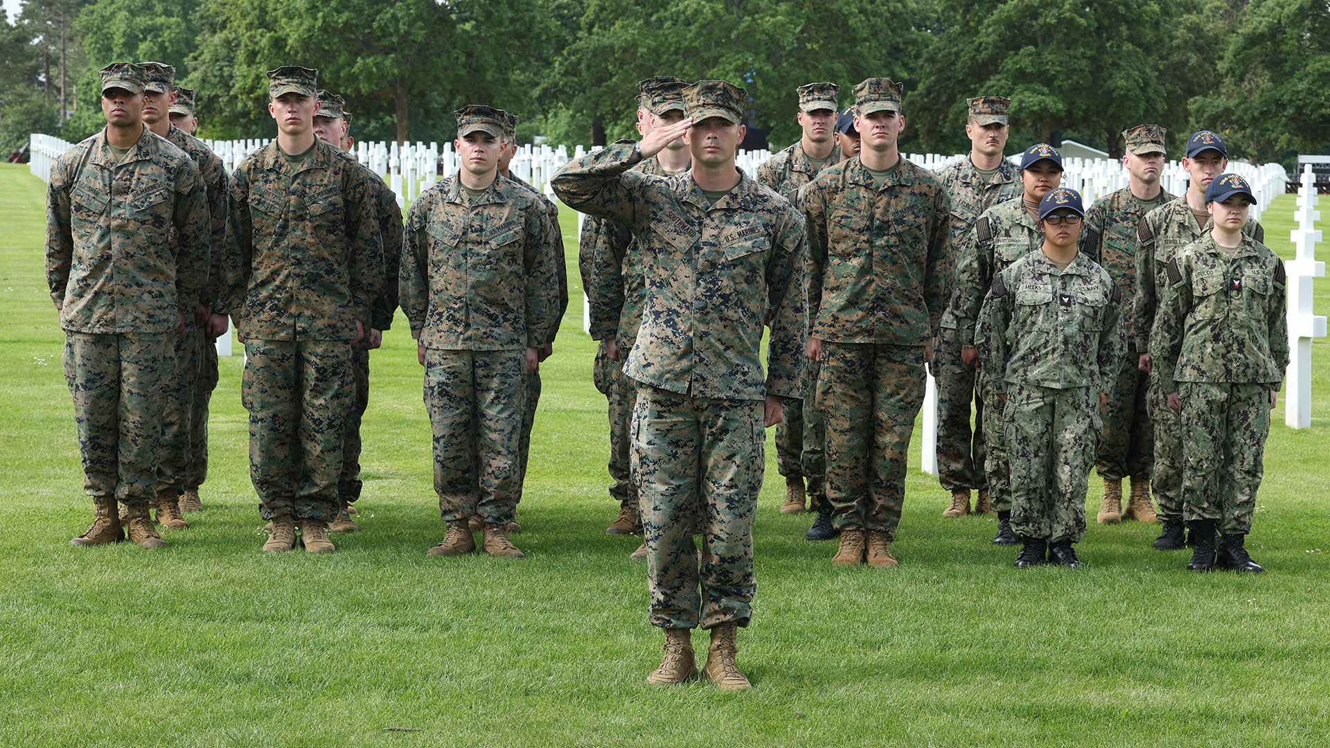 But during rehearsals early on Tuesday morning, it became clear that the sea conditions at low tide would have caused the landing craft to ground on their way to the beaches due to the weight of the equipment onboard, according to U.S. Navy operations planners. Although the 120 Marines were not allowed to conduct the amphibious demonstration at Omaha Beach, about 40 Marines and sailors were flown on helicopters from the dock landing ship USS Oak Hill and amphibious assault ship USS Wasp to attend a service at the American National Cemetery in Normandy.