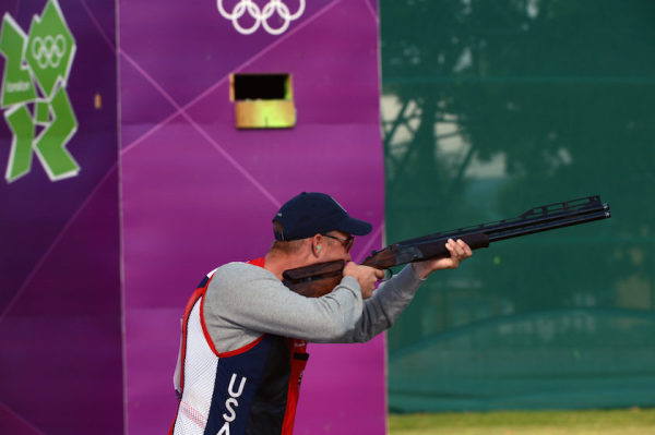 U.S. Army World Class Athlete Program shotgun shooter Sgt. Glenn Eller shoots the opening round of Olympic men’s double trap qualification Thursday morning at the Royal Artillery Barracks range in London.Army photo