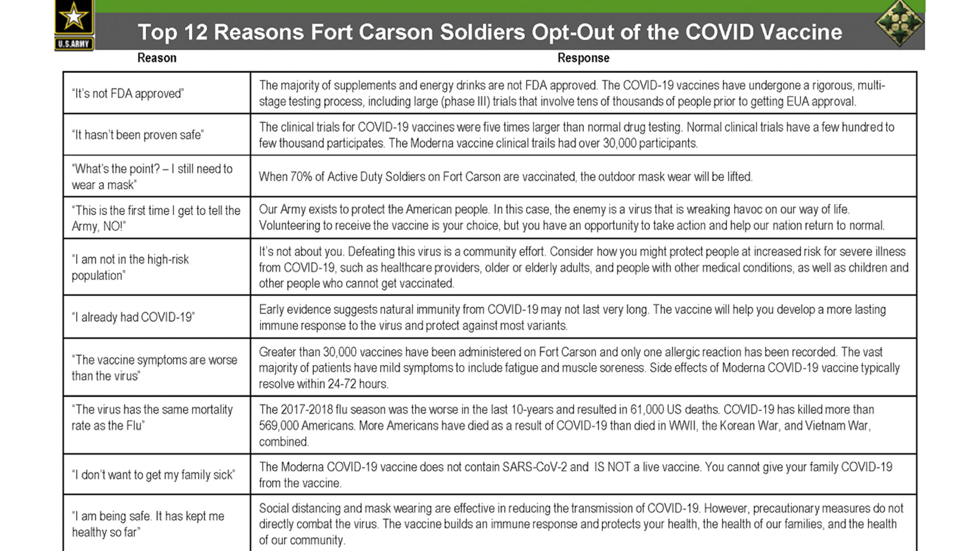 The military has pushed back on the tide of misinformation and lies being spread about the vaccines — such as the unfounded claims that they can lead to infertility and erectile dysfunction — but some soldiers at Fort Carson said they were opting out for a much simpler reason: “This is the first time I get to tell the Army NO!”