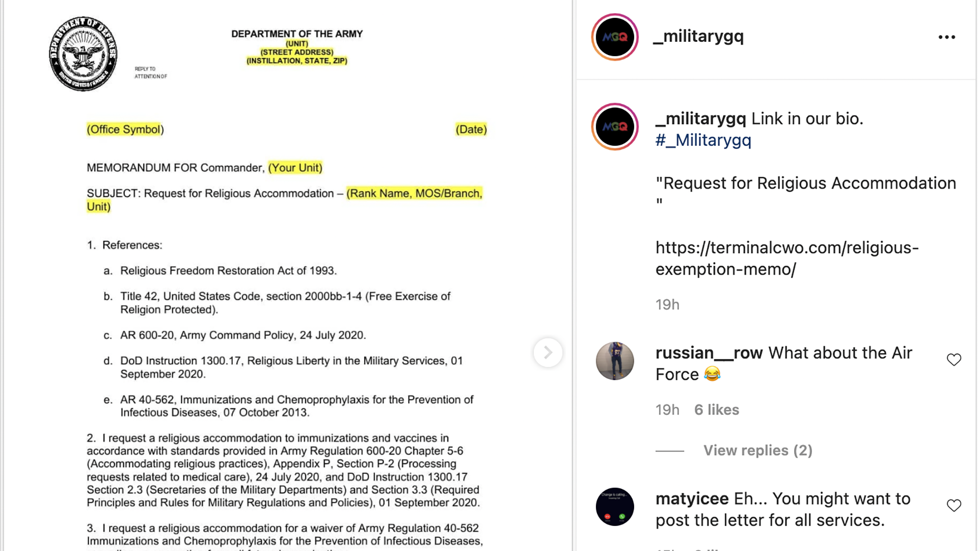 Memes are already being posted on social media showing troops how they can apply for a religious accommodation so that they can opt out of getting vaccinated for COVID-19.