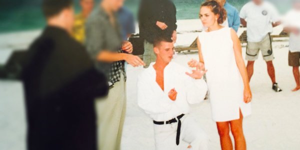 Amazingly, that’s not actually a martial arts getup, just a bridegroom who stumbled out of the ’90s right into this ceremony, and, like, needed to expedite things because there was an OJ-and-vodka bottle in the beach parking lot waiting to be gargled: