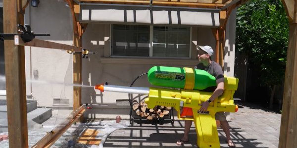 After consulting with Lonnie Johnson, engineer of the original Super Soaker, Rober and Bob Clagett from the YouTube channel “I Like To Make Stuff” spent six months constructing the behemoth water cannon, which is so powerful it can shatter glass, blow up a soda can, and split a watermelon in half.