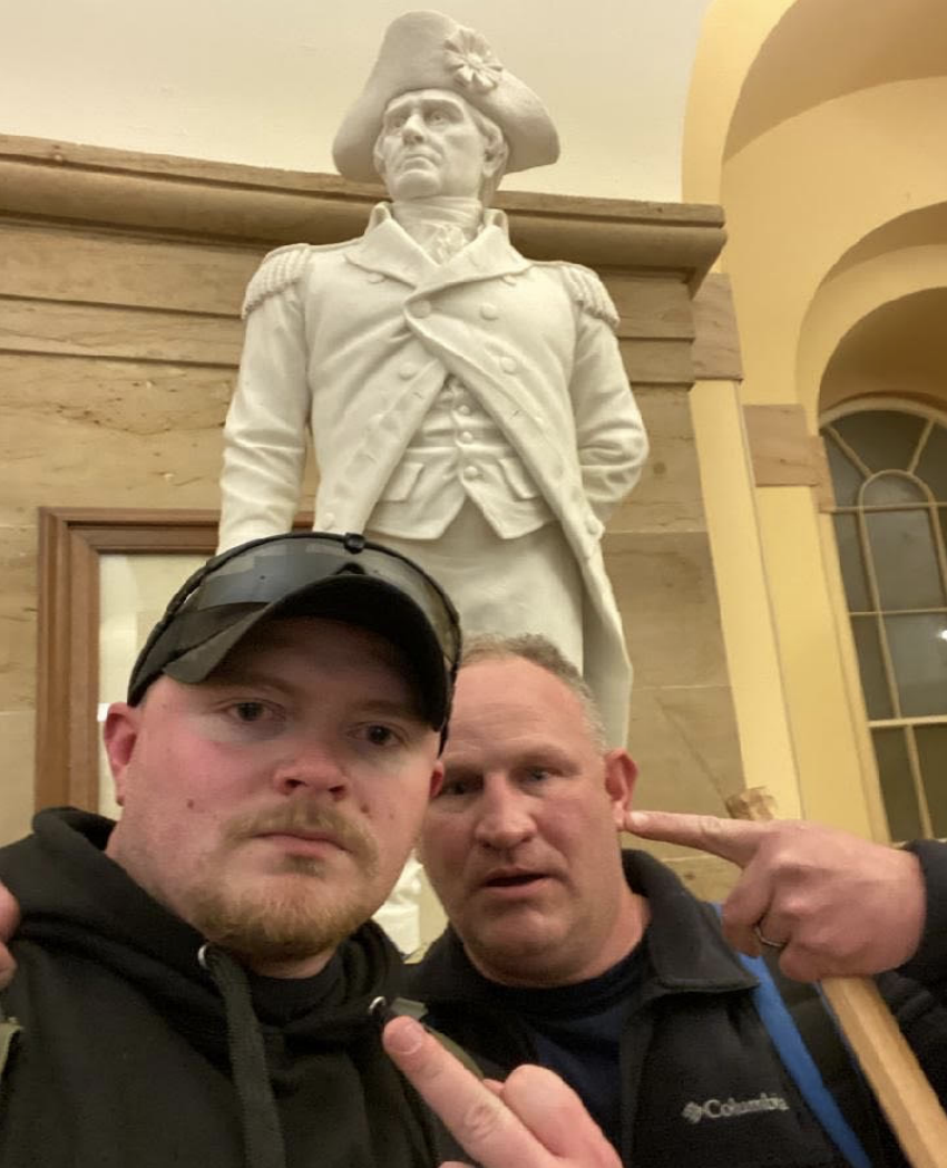 According to the complaint, Robertson was quoted on social media as saying “CNN and the Left are just mad because we actually attacked the government who is the problem … The right IN ONE DAY took the f***** U.S. Capitol. Keep poking us.” The two men took a photo inside the Capitol in which Fracker appears to be flipping off the camera while standing in front of a statue of John Stark.