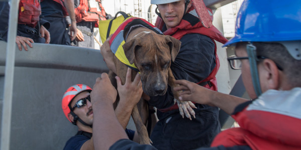 A sailor greets Zeus the dog and his owner Tasha Fuiaba, left, on the boat deck of USS Ashland (LSD 48) after assistance was rendered to their distressed sailboat.U.S. Navy/Mass Communication Specialist 3rd Class Jonathan Clay
